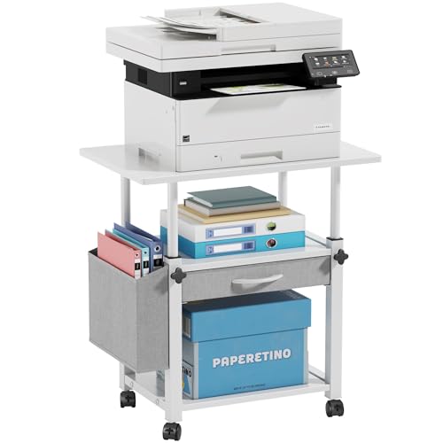 56x38cm Mobile Porta Stampante a 3 Livelli con Cassetto in Tessuto, Supporto per Stampante Mobiletto con Ruote&Borsa Laterale, Altezza regolabile, Scaffale da Scrivania per Ufficio Domestico, Bianco