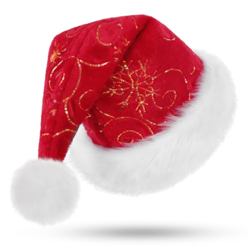 Design spesso e caloreQuesto cappello da Babbo Natale per adulti presenta un bordo in morbida pelliccia sintetica double-face e un design a doppio strato per tenerti caldo e confortevole. Il cappello di Natale è ricamato con motivi a fiocchi di neve ed è dotato di paillettes, che ti rendono scintillante, alla moda e bello!,Cappello da Babbo Natale lucidoQuesto cappello natalizio ha un design accattivante, una combinazione classica di cappelli natalizi e fiocchi di neve. Questi colori trasmettono la gioia del Natale e sono simboli iconici del Natale, aggiungendo unicità alla stagione e facendoti risaltare durante il periodo natalizio.,Adatto a varie occasioniQuesto cappello natalizio è dal design accattivante, il cappello natalizio con motivo a paillettes a fiocco di neve aggiunge unicità al tuo Natale, permettendoti di decorare durante il periodo natalizio. Questo cappello da Babbo Natale per adulti è perfetto per Natale, cosplay, riunioni di famiglia, feste in costume, feste di Natale, feste a tema, eventi allaperto, eventi della comunità, spettacoli teatrali o feste in costume e altro ancora.,Regalo di NataleIl cappello di Natale crea unatmosfera piacevole per la tua riunione di famiglia, aggiungendo un tocco di calore e gioia! Che si tratti di visitare i mercatini di Natale, le feste di Natale o come bella decorazione durante lAvvento e il Natale, questo cappello natalizio è un ottimo regalo per amici e parenti.,Durevole e lavabile in lavatriceQuesto morbido cappello natalizio non stinge, resistente allusura e può essere riutilizzato molte volte. Morbido e confortevole, abbastanza caldo in inverno. La doppia fodera è facile da indossare e da togliere e protegge meglio la tua acconciatura. I cappelli di Babbo Natale sono lavabili in lavatrice.