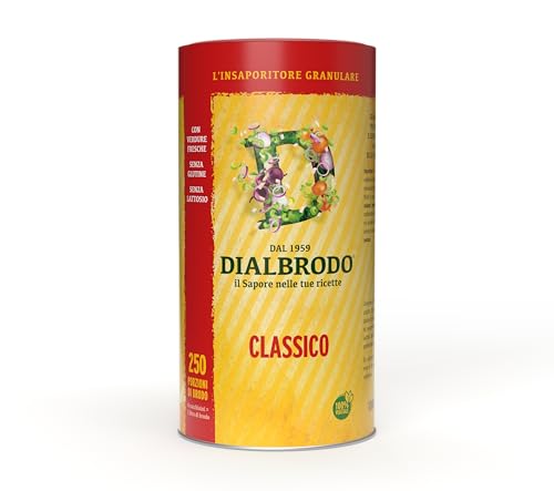 100% GUSTO NATURALE: DIALBRODO Classico è un insaporitore granulare ottenuto da verdure fresche e aromi naturali, perfetto per dare un sapore autentico a brodi, risotti, minestroni e piatti a base di verdure, carne e pesce in sostituzione del sale;,SENZA GLUTINE, SENZA LATTOSIO E VEGANO: Ideale per chi segue unalimentazione senza glutine, senza lattosio e per chi segue una dieta vegana, garantendo sempre il massimo del gusto e della qualità;,QUALITÀ E SICUREZZA: Ogni ingrediente è rigorosamente selezionato e controllato per offrire un brodo sano e bilanciato, senza conservanti, senza grassi idrogenati e senza olio di palma;,CARATTERISTICHE DEL PRODOTTO E UTILIZZO: può essere utilizzato direttamente sui piatti per insaporirli in sostituzione del sale, oppure sciogliendo 1 cucchiaino in 250 ml di acqua bollente per ottenere un brodo gustoso e profumato;,INGREDIENTI: Sale alimentare, esaltatore di sapidità (glutammato monosodico), amido di mais, ortaggi freschi 5% (cipolla, sedano), sedano disidratato 3%, maltodestrine, olio di semi (mais e/o girasole), aroma naturale (contiene sedano).