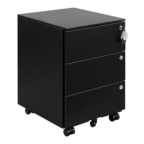 HOMSTEEL Cassettiera Scrivania Mobile, Cassettiera con 3 serrature, 4 Chiavi, 3 Cassetti, in Acciaio, Preassemblato, Nero