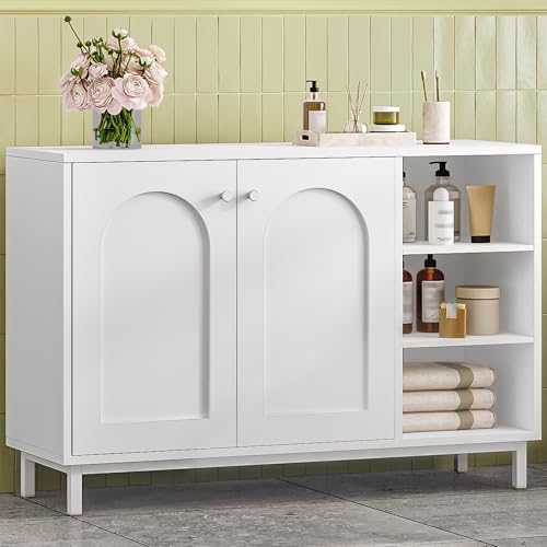 Hzuaneri Mobile da Bagno, Armadietto Autoportante, con 3 Ripiani Aperti Regolabili e 2 ante, Grande Capacità di Stoccaggio, per Bagno, Soggiorno, Ingresso, Cucina, Bianco SC10203W