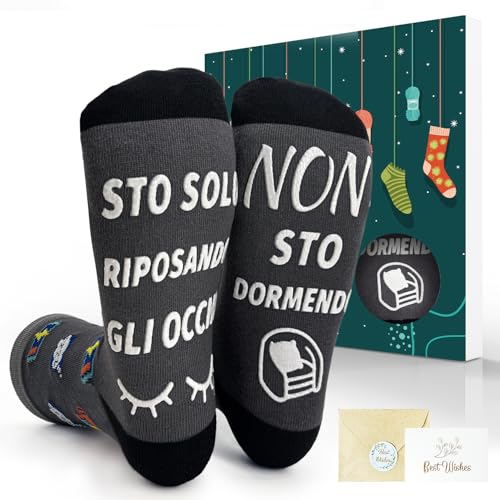 Regalo interessante e creativo: Stai cercando un regalo unico e allegro? Questi calzini sono una scelta eccellente, pratica e divertente, perfetta sia per le donne che per gli uomini; Ideali per Natale, Capodanno, San Valentino, compleanni o come regalo invernale per papà, mamme, nonni, zie, zii, fidanzati, fidanzate, mariti, mogli, fratelli, sorelle o amici cari,Calzini divertenti uomo:Ogni calzino ha la scritta “ Non sto dormendo, Sto solo riposando gli occhi ” stampata sulla suola; non è solo un modo di dire divertente, è uno dei piccoli piaceri della vita,Calzini fantasia: Presentati in una creativa confezione regalo a forma di calzino, sono un regalo ideale, adatto come calzini da casa, calzini sportivi o calzini termici per tenere al caldo chi li riceve per tutto linverno; Taglie 38-44,Calzini confortevoli: Realizzati in cotone di alta qualità con vari disegni ricamati, questi calzini aggiungono un tocco di divertimento e vivacità alla vita di tutti i giorni; La suola testurizzata offre un comfort senza pari, rendendoli la scelta perfetta per rilassarsi dopo una giornata intensa di lavoro,Stile unico: Questi calzini non sono solo divertenti, ma sono anche un modo elegante per mostrare amore e attenzione a donne/uomini, portando un tocco di calore e umorismo al loro abbigliamento quotidiano