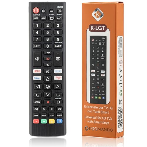 [PRONTO ALL’USO SENZA PROGRAMMAZIONE] Funziona subito: inserisci 2 pile AAA (non incluse) e il telecomando è operativo con tutte le TV LG, anche modelli non smart e meno recenti, senza codici né configurazioni; compatibile anche con TV Samsung,[UNIVERSALE PER TUTTI I TV LG ORIGINALE] Compatibile con TV LED, LCD, OLED, QNED, NanoCell, UHD, 4K, 8K e Smart TV WebOS; supporta serie molto diffuse come UP75, UP80, OLED C2, OLED B1, QNED85 e altre,[SOSTITUISCE NUMEROSI TELECOMANDI LG] Rimpiazza modelli molto diffusi come AKB74915305, AKB75675304, AKB75375604, AKB75095307, AKB74475401 e molti altri (vedi elenco completo in descrizione),[TASTI RAPIDI PER STREAMING] Accesso immediato a Netflix, Prime Video, Disney+ e Rakuten TV; comandi reattivi, tasti morbidi e precisi, con funzioni aggiuntive come TEXT e APP+ per navigazione avanzata,[QUALITÀ KOOMANDO – DESIGN PREMIUM] Finitura antiscivolo, corpo solido e leggero, vano batterie a scatto, tasti resistenti e risposta immediata; assistenza e supporto Europa per un prodotto affidabile nel tempo