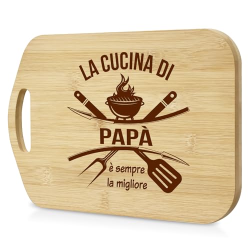 Regalo Natale Papà: Un tagliere in bambù con la scritta “La cucina di Papà è sempre la migliore”. Un regalo personalizzato per papà, che esprime il tuo amore e la tua gratitudine.,Design Multifunzionale su Entrambi i Lati: Un lato è stampato con inchiostro indelebile per una finitura attraente e resistente, ideale per presentare e servire i piatti. Laltro lato presenta scanalature per il drenaggio del succo durante il taglio, mantenendo pulito il piano di lavoro.,Regalo Pratico e Decorativo per Papà: Il tagliere per papà con dimensioni di 31,2 × 22,0 × 1,0 cm, è sia un accessorio indispensabile in cucina che un elegante oggetto decorativo quando non viene utilizzato.,Regalo Papà per Tutte le Occasioni: Questo tagliere per papà è un regalo premuroso e utile per molteplici occasioni. Perfetto come regalo di Natale per papà, unidea regalo per la festa del papà, un regalo per papà da figlia o figlio, un regalo per il compleanno di papà e una brillante ispirazione per regali per papà o regali di tutti i giorni.,Materiale Organico Naturale: Realizzato in bambù organico naturale puro al 100%, questo tagliere per papà è ecologico e salutare. A causa delle variazioni del bambù naturale, il colore e le venature di ogni tagliere possono differire leggermente dallimmagine.