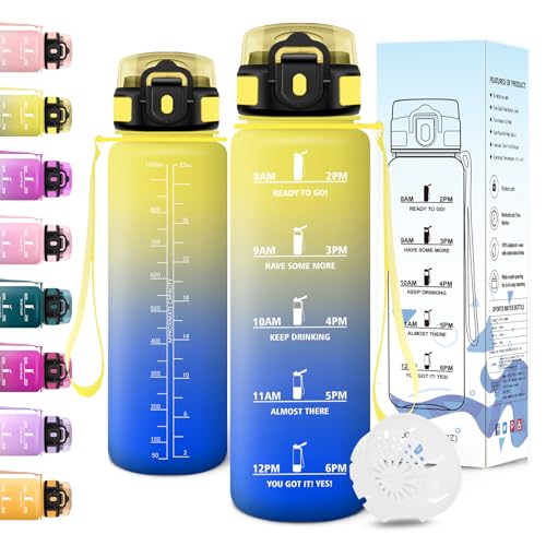 Motswedi Borraccia 1 litro, con Filtro, Borraccia Motivazionale, Prova di Perdite, Senza BPA, Bottiglia Acqua, con Marcatori di Tempo, per Scuola, Palestra, Ufficio, Ciclismo, Giallo & Blu Royal