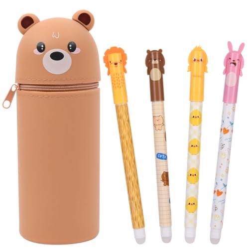 OFFCUP Astuccio Telescopico, Astuccio in Silicone, Portapenne 2 In 1 con Cerniera +4 Penne Cancellabili Impermeabile Durevole per Scuola, Regali di Natale per Ragazzi e Ragazze -Orso