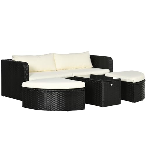 Outsunny Set 5 pz Salotto da Esterno con Tavolino in Vetro, 2 Poltrone e 2 Poggiapiedi in Rattan PE, Nero