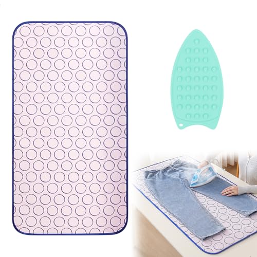 SET TAPPETO DA STIRO: riceverete un tappetino da stiro rosa da 45 x 70 cm e un tappetino da stiro in silicone (i colori del tappetino da stiro sono casuali). È il miglior compagno di viaggio per voi e la vostra famiglia.,MATERIALE: Tappetino da stiro portatile realizzato in materiale di cotone di alta qualità, rivestito con uno strato di fibra per un buon isolamento termico. Lo strato di fibra protegge la superficie della scrivania o del letto dalle scottature ed è un valido aiuto per stirare i vestiti.,RISPARMIO DI SPAZIO: Ironing board pad può essere piegato per essere riposto, molto compatto. Il tappetino da stiro è perfetto per stirare i vestiti e facile da trasportare, è ideale per viaggi, hotel, appartamenti, camper e altro ancora.,USO: Il nostro telo stiro da tavolo può essere utilizzato su qualsiasi superficie, come sul pavimento, nellarmadio, sulla parete, sulla scrivania o sul letto, come alternativa allasse da stiro. Basta dispiegare il nostro tappetino da stiro su una superficie piana e iniziare a stirare i vestiti.,FACILE DA PULIRE: Tappeto da stiro da tavolo per la pulizia, lavare semplicemente a mano. Non lavare e asciugare in lavatrice per evitare la deformazione del tappetino da stiro.