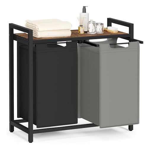 2 scomparti per dividere: Questo porta biancheria offre una capacità totale di 92 L (46 L per ogni sacco); il design a 2 scomparti ti aiuta a organizzare i capi per tipo o dividere chiari da scuri,Ripiano utile: Il piano d’appoggio di questa cesta portabiancheria ti offre spazio aggiuntivo; il design a doghe permette una buona aerazione per evitare accumulo di odori del bucato sporco,Sacco estraibile e rimovibile: Ogni sacco è supportato con un pannello in plastica nella parte inferiore per evitare cedimenti; grazie alla chiusura a strappo, puoi facilmente estrarlo o rimuoverlo,Robusto e stabile: Con tubo d’acciaio da 2 cm e pannello MDF, questo portabiancheria può reggere fino a 20 kg sul piano; ogni sacco in tessuto Oxford è resistente all’acqua; i 4 piedini regolabili lo mantengono in equilibrio,Versatile Questa cesta per biancheria si adatta bene alla lavanderia, al bagno o alla camera da letto. Se il ripiano si bagna durante l’utilizzo, asciugalo immediatamente con un panno asciutto