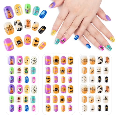 MELLIEX 72 PEZZI HALLOWEEN UNGHIE FINTE COLORATE CORTE PER BAMBINI, UNGHIE PRE-INCOLLATI UNGHIE FINTE ARTIFICIALI PER RAGAZZA DONNA