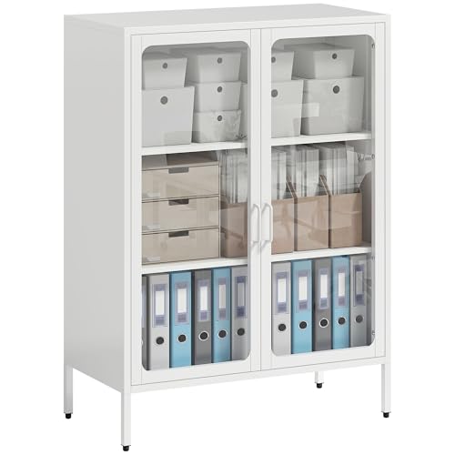 HOMCOM ARMADIO PORTADOCUMENTI IN ACCIAIO A 2 ANTE IN VETRO TEMPERATO, SCHEDARIO DA UFFICIO CON RIPIANI REGOLABILI, MOBILETTO MULTIUSO PORTAOGGETTI, PER UFFICIO STUDIO CASA, 80X40X110 CM, BIANCO