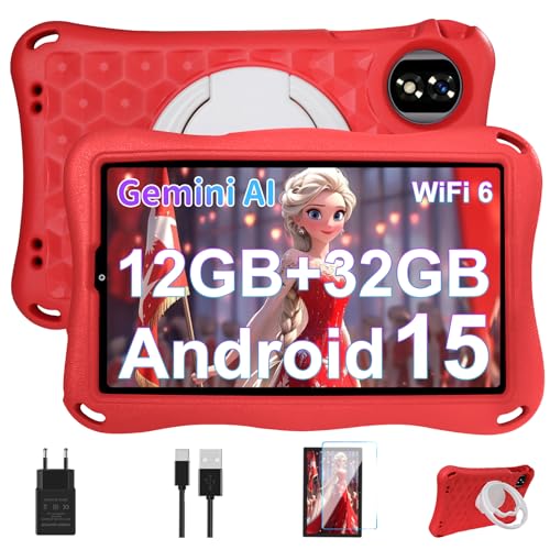 TABLET BAMBINI 9 POLLICI ANDROID 15 TABLET CON GEMINI AI, 12GB RAM+32GB ROM/TF 2TB, OCTA-CORE, 2.0GHZ, 5G WIFI 6, BT5.0, 8+5MP,5000MAH,WIDEVINE L1,PARENTALE CONTROLLO TABLETS CON EVA CASO-ROSSO